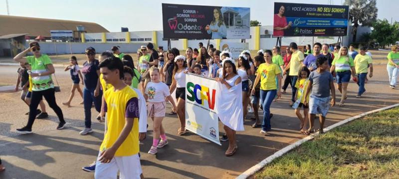 Atendendo convite da Apae , o grupo de dança Arco Íris , composto por crianças e adolescentes do SCFV, participaram da passeata e abrilhantaram a tarde, com uma apresentação de dança juntamente com alunos da Apae.
