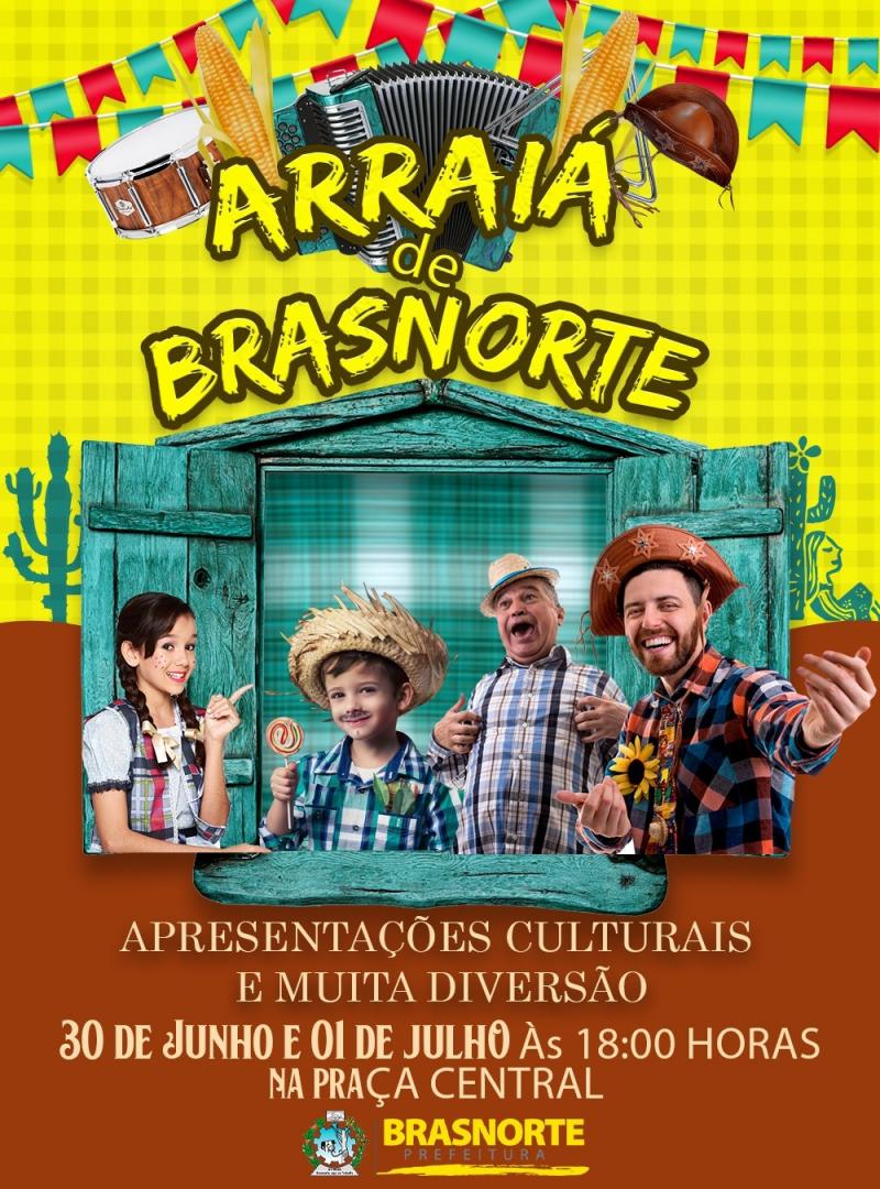 A prefeitura de Brasnorte promove de 30 de junho a 1º de julho o Arraiá de Brasnorte. O evento vai acontecer na Praça Central a partir das 18 horas e será aberto para toda a população com apresentações culturais, show de Montenegro e muita diversão para toda a família.