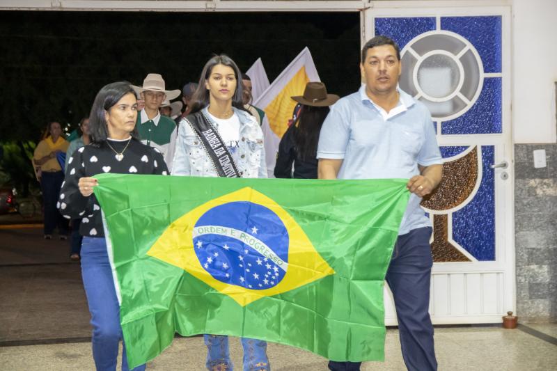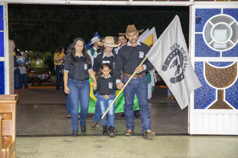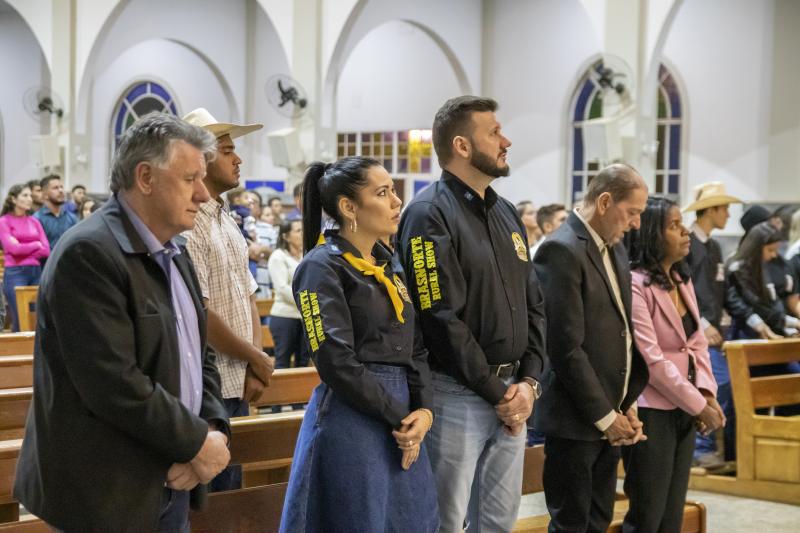 Durante a celebração, o prefeito Edelo Ferrari e a primeira-dama Lorena Barros entraram com a imagem de Nossa Senhora.