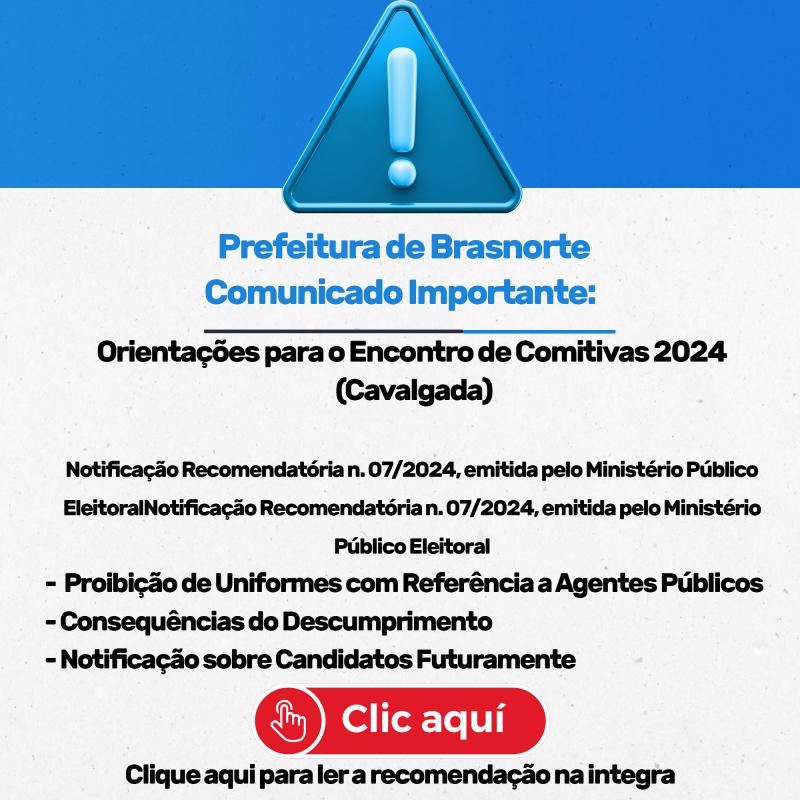 Em conformidade com a Notificação Recomendatória n. 07/2024, emitida pelo Ministério Público Eleitoral, comunicamos a Vossa Senhoria as seguintes orientações relativas à participação no Encontro de Comitivas 2024 (Cavalgada), a ser realizado no dia 25 de maio de 2024: