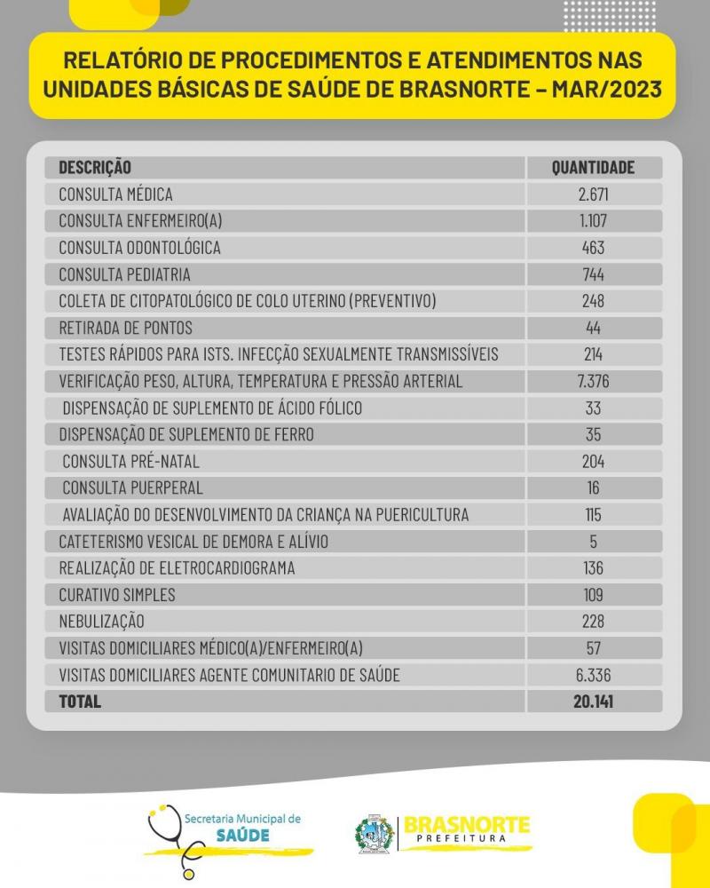 A Secretaria Municipal de Saúde de Brasnorte divulgou nesta quinta-feira, 13, o Relatório de Procedimentos e Atendimentos nas Unidades Básicas de Saúde referentes ao mês de março. Ao todo, 20.141 procedimentos foram realizados em 30 dias.